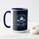 Una hermosa y rústica temática, una gran taza de café de dos tonos con el nombre de su familia y "Lake House" u otro texto deseado junto con su fecha y ubicación establecidas. Este diseño personalizado y único presenta una silueta blanca de remos cruzados y pinos sobre una huella de tablas de madera de colores azules. Para ver más diseños como este, siéntase libre de visitar mi tienda aquí en "Zazzle.com/Rustic_Charm". ¡Gracias.