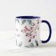Moderno estilo rústico estacional de vacaciones de invierno tazas de café con verde azulado marino y colinas de agua verde de caza, bayas y dos pájaros cardenales rojos junto con el libreto editable de tipografía rosa oscuro "Happy Holidays". Fácil de personalizar con tu texto +++++++++ Un regalo de vacaciones para Navidades amables para la familia o socios empresariales.