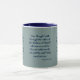 Esta taza de dos tonos muestra un tipo de letra de la letra del silbato con letras azul marino mostrando el verso de la biblia "Salmos 23:4 KJV" sobre un fondo verde plateado. Este verso hace referencia al capítulo 23 del Libro de los Salmos, que muestra el cuarto verso de esta escritura biblia, que cita el tema de la biblia del Rey James. La llanta y la manecilla están acristaladas con colores a juego disponibles en la construcción de cerámica de microondas y lavavajillas de 11 onzas o 15 onzas.
