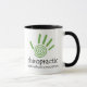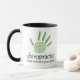 Esta taza de la quiropráctica ofrece una impresión y un texto espirales verdes de la mano que diga la "quiropráctica - salud sin una prescripción."