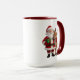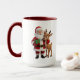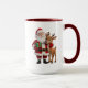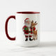 A digital cartoon image shows Santa Claus standing next to Rudolph the Reindeer. Santa is wearing his traditional red suit with white trim, a black belt with a gold buckle, and black boots. He holds a green gift wrapped with a red ribbon. Rudolph is a light brown color and is leaning against Santa, with a red mitten on Santa's shoulder. The background is solid black, emphasizing the characters.