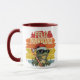 Santa frog with black glasses Feliz Navidad design on vintage sunset mug.