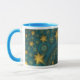 La taza de café con el "Santo-Remy revisitó" un diseño abstracto de Susan Wallace. © 2007, Susan Wallace de Copyright. Las estrellas brillantes del oro repiten sin fin en un campo de la turquesa vibrante. Diseño envuelto completo.