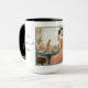 Un tazón de estilo retro con una mujer amante del té saboreando su té, dos gatos cerca, cortinas de encaje y un encantador y acogedor refrán para los amantes del té.
