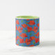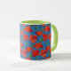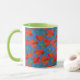 Una taza de café de moda, con un labio y mango verde y Scarlet Field Poppies sobre un fondo rico azul (excelente regalo para cualquiera con un cumpleaños de agosto). De un collage de papel pintado a mano de Judy Adamson, este diseño floral brillante forma parte de la colección "Poppy Fields" de Posh & Painterly.