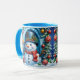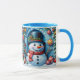Ein niedlicher Schneemann vor einer hübschen Weihnachtsdeko. Mit Tannenzweigen und Christbaumkugeln. Digital erstellt.
