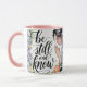 Un suave ilustracion acuarela de una mujer rezando, rodeado de suaves acuarelas y la cita "Be Still and Know" en un elegante estilo caligráfico personalizado con nombre.