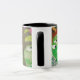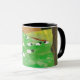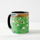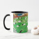Una taza blanca con mango negro y llanta y un diseño de collage de papel pintado a mano de ovejas.