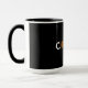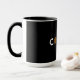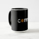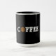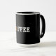 Esta taza muestra la palabra CAFÉ en letras blancas con la letra "O" reemplazada por una ficha con tonalidad de latón que es "Buena para un café". Esta taza de café está diseñada para ser casi totalmente negra por dentro y por fuera, con sólo indicios de los acentos blanco y de latón.