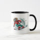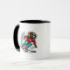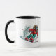 This ceramic coffee mug is shown with a sports skier art print.