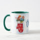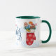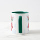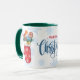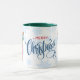 Esta taza festiva es un buen regalo para los vecinos, amigos y familia. Cada lado tiene una imagen de un copo de nieve rojo y blanco adornado con migajas llenas de muchos dulces de Navidad, como dulces, paquetes de regalo, una rodaja de naranja y campanas de oro. Entre las imágenes hay un texto estilizado en rojo y azul que dice "FELIZ NAVIDAD". Las imágenes y el texto se colocan en un sutil fondo azul de copo de nieve.