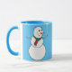 Disfruta de tu café, huevos o cacao en una taza super linda que tiene un muñeco de nieve feliz contra un fondo azul cielo a cada lado. La elección de los colores de manejo está disponible. Obra de arte de la ropa y los coleccionables de Buttercup.