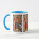 La elección es suya si añadir un fondo colorido a esta bonita taza o dejarla como está. + San Alfonso María de Liguori (1696-1787) fue un noble italiano, un abogado convertido en sacerdote, un prolífico escritor, fundador de los Redentoristas, Obispo y Médica de la Iglesia. Aquí, en una capilla con un fondo de ladrillo rojo, se pone de pie vistiendo las túnicas de su Obispo —más suave y lisa— y llevando su personal crosier o pastoral. Su mano derecha se levanta con bendición. En el arte, cuando se le retrata en un ángulo con el espectador como en esta imagen, se le arroja una palmadita hacia atrás y una barbilla en el pecho. En mayo de 1768 fue golpeado por un terrible ataque de fiebre reumática que duró más de un año y lo dejó inválido hasta su muerte unos veinte años después. Por esta razón, es el santo patrón de la artricia reumatoide y el enfermo de edad. + Festín: 1 de agosto + Crédito de la imagen (SAU 039): Imagen antigua de San Alfonso Liguori de una impresión devocional de finales del siglo XIX en cromolitografía, publicada originalmente por la Socièté de St. Augustin, Brujas, Bélgica, de la colección privada de ephemera religiosa del diseñador.