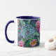 Suculentos tropicales exóticos color agua, cactus y plátanos dejan flores en el jardín sobre un fondo azul oscuro.