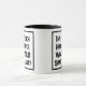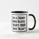 Divertido lema en un tazón de café de dos tonos que dice "Soy un jugador francés de la bocina. ¿Cuál es TU supertalento?". Dos tazas de café para un cuerno francés o alguien que toca el cuerno francés. Texto en negrita en blanco y negro.