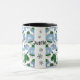 Café de tema invernal con un lindo patrón de estilo nórdico de sudaderas gruesas, gorras, mitones, medias y copos de nieve escandinavos en tonos azules con acentos verdes. Personalice el nombre en el sencillo botón "Personalizar" de Zazzle.