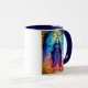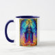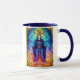 Mug in an illustration of The Magician tarot card symbolizing manifestation, power, and divine connection. Clad in radiant robes and framed by elemental fire and celestial light, he channels energy between heaven and earth. The infinity symbol above represents limitless potential and mastery. He embodies the will to create one’s own reality.