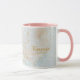 Elegante tema de astrología zodiac Taurus la estrella del toro Coffee Mug sobre sutil fondo cósmico moteado azul hielo. El nombre de monograma y los detalles del texto de la tipografía de fuente popular se pueden personalizar fácilmente. Un toque de purpurina celestial de oro falso añade un poco de glamour y mística. Disponible en los 12 signos de zodiaco