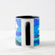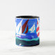 Una taza del campanero, blancas con la manija y el borde negros, el diseño de los barcos de navegación se hace de un collage de papel pintado a mano.