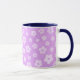 Hermosas flores moradas y blancas con dos tonalidades de café y taza de té con mango azul e interior.