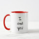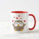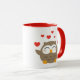 Pequeño ilustracion lindo y feliz de búho con cálidos corazones rojos volando por ahí. Un pájaro gracioso de colores marrones claros y con patas amarillas brillantes. Esta lechuza trae felicidad y amor, y le gusta animarte o enviar los mejores deseos a alguien que quieras. También puede personalizar de los antecedentes de sus necesidades.