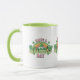 Una taza con una imagen temática del Día de San Patricio. Un diseño de estilo retro grunge que dice: "Que tengas suerte. Con un arcoiris colorido detrás. Palabras escritas en un ambiente retro redondeado y gordo. Colores rosa y verde.