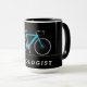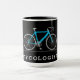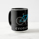 Texto de un cicólogo con una bicicleta azul turquesa en la línea negra. Se puede cambiar el color de fondo.