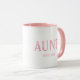 Diseño de taza de café de tía con año de establecimiento con una fuente estampada en rosa sobre un fondo blanco. ¡Haga clic en personalizar para editar el color de fondo!. Visite nuestra tienda para ver esta taza en una gran variedad de nombres de abuelos.
