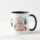 ¡Esta es una linda taza de vacaciones que traerá algunas sonrisas! A cada lado hay un colorido diseño gráfico y un texto que dice "Cuando dejas de creer te dan medias". Entre las imágenes está la cara de un gato negro enfurecido con un sombrero de Santa rayas rojas y blancas.