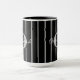 Rayas grises por toda esta taza de café sobre negro con un interior y mango en negro. Un monograma se sienta en el centro para que usted lo personalize. Aquí se muestra un ejemplo de monograma de una "O" y un texto brioso que dice "Oakland" a través de la O. Agarra algunas para su próximo domingo en la cueva. Personalizar o compra como se muestra.