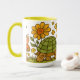 Esta tortuga retro psicodélica y feliz, en un campo de flores, setas, mariposas y caracoles, tiene las vibraciones de los años 60 y 70.