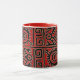 A bold red and black tribal-inspired design featuring spirals, diamonds, and hand-like shapes arranged symmetrically, evoking ancient and cultural art motifs.
