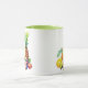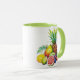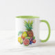 Mug in a collage of colorful tropical fruits including pineapple, papaya, mango, gogi berries, kiwi, and lime, with a tropical theme of rich textures and lush foliage.