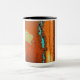 This 15 oz Two Toned Combo Mug is covered with an abstract rustic design in shades of orange, brown, and turquoise.