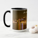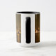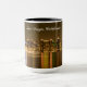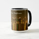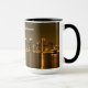 Typography Black Gold San Diego Souvenir Mug: Esta es una fotografía del skyline de San Diego tomada en la noche en octubre de 2020. Las luces de los rascacielos se reflejan en el agua de la bahía y la luz de la luna llena que estaba creciendo en ese momento propició esos colores oscuros y cálidos. Esta foto está disponible en productos que hacen el recuerdo perfecto de San Diego para usted o como regalo.