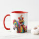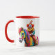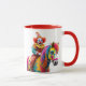Un clown drôle avec un énorme nez rouge, un sourire éclatant et un maquillage blanc rigolo monte un cheval arc-en-ciel qui a une crinière colorée et une selle décorée, il porte un costume à pois et à carreaux avec un pantalon assorti et des chaussures brillantes, son chapeau pointu complète son look excentrique, il tient les rênes en rigolant, prêt à faire un spectacle incroyable sous le chapiteau du cirque, ce duo haut en couleur attire tous les regards et promet une explosion de rires et de bonne humeur.