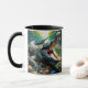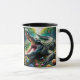 Un énorme crocodile géant allongé au bord d’une rivière calme, entouré de fleurs tropicales et de papillons colorés, ouvre grand sa gueule au milieu d’une forêt tropicale, baignée de lumière et de nature luxuriante et sauvage.