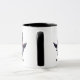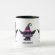 Una taza con un divertido ilustracion temático de Halloween para los amantes de los gatos. Un gato negro de ojos grandes vestido con el gorra de una gran bruja negra con un cinturón rosado violáceo alrededor del borde.