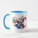 Un petit lapin super-héros qui saute dans les airs. Il porte un costume bleu avec une ceinture et un logo sur le torse qui le rendent encore plus fort. Son masque bleu lui donne un look mystérieux et sa cape rouge flotte derrière lui. Il tient un grand bouclier rond, prêt à se défendre ou à protéger les autres. Avec son sourire et ses grandes oreilles, il a l'air super sympa et courageux.