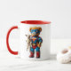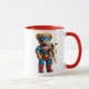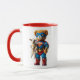 Un ours costumé en super-héros, avec un masque bleu et une cape rouge, tient dans ses bras un petit chevreau. Son expression bienveillante et son allure protectrice donnent une impression de force et de tendresse à la fois. Ses grandes bottes rouges et sa ceinture dorée ajoutent une touche de style héroïque. Le chevreau, calme et confiant, repose dans ses bras, créant une scène attendrissante. Ce design coloré et chaleureux plait aux enfants et aux amateurs d’illustrations mignonnes et dynamiques.