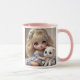 Une image pleine de douceur d'une petite fille aux grands yeux expressifs et aux joues rosées, assise avec élégance aux côtés d’un adorable chiot blanc, tout aussi charmant qu’elle. Son look délicat est sublimé par une salopette rose pastel assortie à son grand nœud dans les cheveux, tandis que son pull vert apporte une touche contrastée et harmonieuse. Son compagnon canin, avec son pelage soyeux et son petit ruban assorti, ajoute une dimension encore plus attendrissante à la scène.