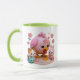 Une poule sur un mug, est étonnée par le spectacle insoutenable, quel choc, son oeuf est cassé, ses amis constatent les dégâts, pauvre poulet.