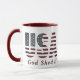Esta taza patriótica muestra las letras de EEUU, en las estrellas y rayas de la bandera estadounidense, en el frente y en la parte de atrás con las palabras 'Dios derramó su gracia sobre ti' envueltas alrededor de la taza.