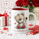 A sweet, fluffy teddy bear sits holding a red rose, surrounded by playful red and white hearts. With polka-dotted feet and soft fur, the bear radiates warmth and affection.