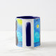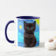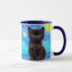 Coffee Mug con un gato negro en la pintura Starry Night de Van Gogh! Este gatito de ojos azules mira adorablemente desde un fondo de remolinos azules y una brillante luna amarilla. ¡Un regalo fantástico para los amantes del gato y para los coleccionistas holandeses de arte!