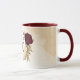Hermosa taza de café con flores de color burdeos y beige dorado con hojas verdes .