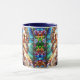 Virgen María con el Niño Jesús en un estilo de vidrio manchado de mosaico de azulejos. Copa de café brillante, hermosa y colorida.