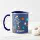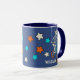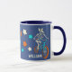 This mug features my hand drawn illustrations. There's a werewolf skeleton riding a BMX bike along with coordinating star graphic is aqua blue, orange and ivory. There's a spot to add a name or other custom text. The name and werewolf appear on both sides of this mug.
