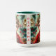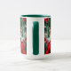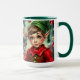 A sweet Christmas coffee mugs that can be personalized with a cute elf cartoon and a festive background.