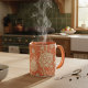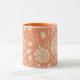Una taza de café con el patrón floral diseñado por William Morris, el artista británico conocido por sus diseños de papel pintado. Flores de tulipán salvajes sobre un fondo de melocotón.